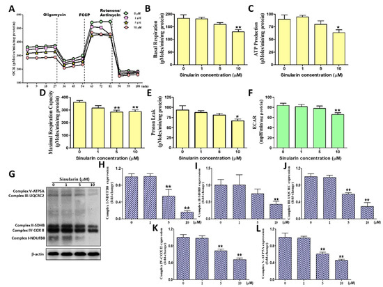 The oxygen consumption rate (OCR) of the mitochondria was measured following the sequential addition of inhibitors that specifically targeted the enzymatic complexes of the OXPHOS. The sequentially added inhibitors were oligomycin, which inhibits ATP synthase (also known as complex V), FCCP, which uncouples the OXPHOS, and rotenone, which inhibits complex I. Utilizing these inhibitors enabled us to derive the following mitochondrial respiration parameters: Basal respiration, ATP production (coupled respiration), maximal respiration, and proton leakage (uncoupled respiration). To understand the impact of sinularin on mitochondrial respiration, each respiration parameter was measured following treatment with sinularin at 0, 1, 5, and 10 μM for 4 h, quantified protein, and normalized respiration parameter in SK-HEP-1 cells (Figure 3A). After treatment with 10 μM of sinularin, our results demonstrated that basal mitochondrial respiration, ATP production, maximal respiration and proton leakage were significantly decreased to 130.08 ± 9.09, 63.33 ± 5.63, 287.08 ± 13.69 and 66.75 ± 4.53 pMoles/min/mg protein, relative to the control at 183.55 ± 13.58, 90.00 ± 8.35, 360.89 ± 12.84 and 93.56 ± 10.56 pMoles/min/mg protein, respectively (Figure 3B–E). A subsequent study was performed to measure the extracellular acidification rate (ECAR), which is an indicator of cellular glycolysis. Our findings demonstrated that 10 μM sinularin caused a significant decrease in ECAR to 65.75 ± 3.60 mpH/min/mg of protein, relative to the control (83.58 ± 4.38 mpH/min/mg of protein) (Figure 3F). We also monitored the expression levels of subunits of enzymatic complexes I to V protein using Western blot analyses by normalization -actin (Figure 3G). The subunit of complex I used for the Western blot analyses was NDUFB8, while the subunits for complex II, III, IV, and V were SDHB, UQCRC2, COX II, and ATP5A, respectively. Our results showed that the expression levels of all the tested subunits were significantly lowered after being treated with 10 μM of sinularin, to 0.16 ± 0.01, 0.43 ± 0.04, 0.29 ± 0.05, 048 ± 0.02, and 0.45 ± 0.01, relative to the control (normalization to 1), respectively (Figure 3H–L). These observations indicated that sinularin effectively decreased mitochondrial respiration, the glycolytic rate, and 5 OXPHOS complexes protein, causing mitochondrial dysfunction in SK-HEP-1 cells.