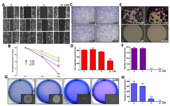 Drug-induced inhibition of cell migration is an indicator that demonstrates if a drug has the potential to ablate cancer metastasis. We conducted a wound-healing assay and a transwell chamber migration assay, in which 0, 1, 5, and 10 μM of sinularin were applied. Following 48 h incubation of wound healing using the scratch assay, our findings showed that 1, 5, and 10 μM of sinularin could significantly abate the wound healing potential (Figure 4A,B). Following 4 h incubation in the transwell chamber migration assay, our results demonstrated that 10 μM of sinularin significantly decreased the migration ability of SK-HEP-1 cells to 282.25 ± 29.23, relative to the control, at 620.08 ± 23.46 (Figure 4C,D). We next evaluated the colony formation potentials of attached and non-attached SK-HEP-1 cells individually in separate experiments. For the attached cells, the colony formation potential was significantly decreased to a non-detectable level after being treated with 5 and 10 μM of sinularin, relative to the control, at 47.33 ± 2.02 (Figure 4E,F). For the non-attached cells, the colony formation potential was significantly decreased to a non-detectable level after being treated with various concentrations of sinularin, relative to the control, at 356.33 ± 50.80 (Figure 4G,H). These results suggested that the utilization of various concentrations of sinularin could significantly diminish cell migration and clonogenic formation, causing inhibition metastasis in SK-HEP-1 cells.