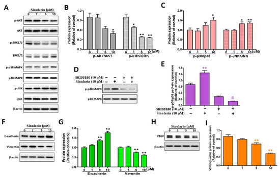 The effects of sinularin on AKT, MAPKs, E-cadherin, vimentin, and VEGF protein expression levels in SK-HEP-1 cells. SK-HEP-1 cells were treated with different concentrations of sinularin for 24 h. (A) The cell lysates were subjected to Western blot analyses with antibodies against p-AKT, AKT, p-ERK1/2, ERK1/2, p-p38 MAPK, p38 MAPK, p-JNK, and JNK and the internal control β-actin. Full, uncropped Western blot gels are shown in Supplementary Figure S3A. (B) p-AKT, AKT, p-ERK1/2, and ERK1/2 protein levels, quantified by densitometry analysis using ImageJ software after being normalized with the β-actin level. (C) p-p38 MAPK, p38 MAPK, p-JNK, and JNK levels, quantified by densitometry analysis using ImageJ software after being normalized with the β-actin level. (D) Pre-treatment with SB203580 reversed sinularin-induced p38 protein level. The cell lysates were subjected to Western blot analyses with antibodies against p-p38 MAPK and p38 MAPK. Full, uncropped Western blot gels are shown in Supplementary Figure S3B. (E) p-p38 MAPK and p38 MAPK protein levels, quantified by densitometry analysis using ImageJ software. (F) The cell lysates were subjected to Western blot analyses with antibodies against E-cadherin, vimentin, and β-actin. Full, uncropped Western blot gels are shown in Supplementary Figure S3C. (G) E-cadherin and vimentin protein levels, quantified by densitometry analysis using ImageJ software after being normalized with the β-actin level. (H) The cell lysates were subjected to Western blot analyses with an anti-VEGF antibody and β-actin. Full, uncropped Western blot gels are shown in Supplementary Figure S3D. (I) VEGF protein levels quantified by densitometry analysis using ImageJ software after being normalized with the β-actin level. Each bar represents the mean ± SE of three independent experiments. The results were analyzed using Student’s t-test and ANOVA to determine the significance, in which * p < 0.05, ** p < 0.01, and # p < 0.01, relative to the 10 μM sinularin-treated group.
