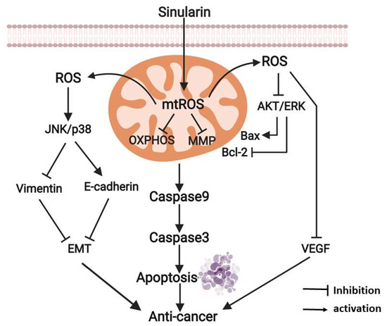 Following the understanding of the cytotoxic effects of sinularin, this compound was evidenced to induce mitochondria-associated anti-tumorigenesis signaling. The sinularin-induced anti-cancer mechanisms are proposed in Figure 7. As illustrated, sinularin inhibits the mitochondrion via the induction of mtROS, which is also induced by the blockade of MnSOD. The mtROS subsequently leads to the disruption of the OXPHOS in parallel with the disturbance to ΔΨ. The respiratory capacity of the mitochondrion is accordingly damaged. Such mitochondrial dysfunction results in the initiation of caspases 3/9 mediated apoptosis. Notably, significant disturbances to the mitochondrial membrane potentially stimulate additional ROS generation as a result of the disruption of the OXPHOS [31]. The elevated mtROS contributes to increasing intracellular ROS levels, which are unable to be normalized by Cu/ZnSOD as this superoxide dismutase is also ablated by sinularin. The resultant elevated intracellular ROS levels further attenuate AKT and ERK activities, which subsequently inhibit Bcl-2 and augment Bax. In addition, such ROS over-production inhibits VEGF while promoting the phosphorylation status of JNK and p38, leading to the down-regulation of vimentin and the up-regulation of E-cadherin. The changes in these two EMT regulators accordingly impact the EMT. Taken together, these inhibition effects result in anti-cancer effects that could effectively prevent hepatocellular cancer progression.