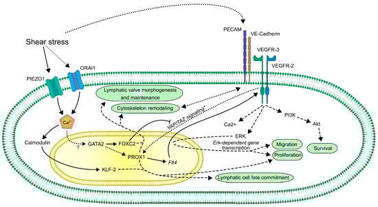 Although the PECAM–VE-cadherin–VEGFR-2/3 mechanoreceptor complex has been investigated in BECs, the results indicating the involvement of PECAM [] and VE-cadherin [] in lymphatic valve formation and lymphatic remodeling, in combination with the well-known functions of VEGFR-3 in lymphatic development, suggest that these molecular factors may also contribute to these mechanical force-dependent processes in LECs.