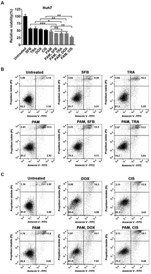 2.5. Selective Additive Effects of PAM and the Specific Anti-Cancer Agents in Huh7