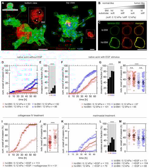 2.1. Substrate Stiffening, Impaired BM Mechanics and Aberrant EGF Induce Invasion Synergistically