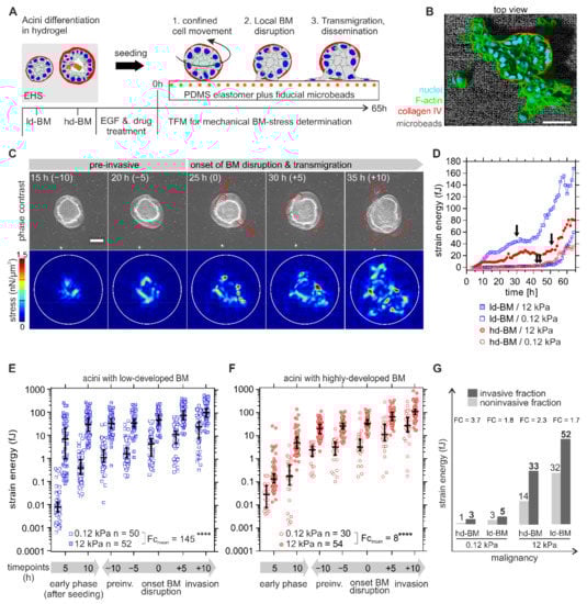 Gaiko-Shcherbak, A.; Eschenbruch, J.; Kronenberg, N.M.; Teske, M.; Wolters, B.; Springer, R.; Gather, M.C.; Merkel, R.; Hoffmann, B.; Noetzel, E. Cell Force-Driven Basement Membrane Disruption Fuels EGF- and Stiffness-Induced Invasive Cell Dissemination from Benign Breast Gland Acini. Int. J. Mol. Sci. 2021, 22, 3962. https://doi.org/10.3390/ijms22083962