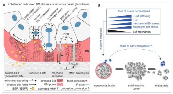 - Chang, T.T.; Thakar, D.; Weaver, V.M. Force-dependent breaching of the basement membrane. Matrix Biol. J. Int. Soc. Matrix Biol. 2017, 57–58, 178–189. [Google Scholar] [CrossRef]
