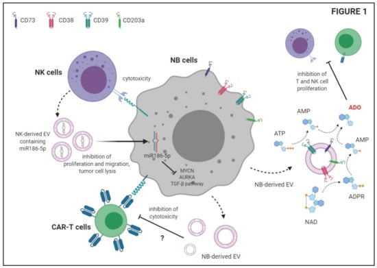 We recently characterized the immunosuppressive function of NB-derived EV. In particular, we analyzed the expression and function of adenosinergic ectoenzymes CD38, CD39, CD73 and CD203a/PC-1 on NB cell lines, metastatic NB cells derived from patients’ BM samples, and on NB-derived MV. First, we demonstrated that NB cell lines expressed higher levels of CD38 and CD39, and lower levels of CD73 and CD203a/PC-1, than metastatic NB cells. Similar results were obtained by analyzing MV isolated from these two NB cell populations, with the exception of CD39, whose expression was higher in MV from metastatic NB than in those from NB cell lines []. We also demonstrated that adenosinergic ectoenzymes are expressed also on resident BM cell populations (lymphocytes, granulocytes and monocytes). Such expression was not affected by the presence of metastatic NB cells in the BM microenvironment, with the exception of CD73, which was up-regulated on myeloid cells upon NB infiltration. Indeed, we demonstrated that the expression of CD73 (and also that of CD38 and CD39) increased upon co-culture with NB cells in vitro. Thus, these data suggested that MV endowed with adenosinergic ectoenzymes may be released in the BM microenvironment by both resident cells and infiltrating NB cells []. Next, we characterized EV isolated from BM plasma samples of NB patients and healthy controls. NB-derived EV expressed higher levels of CD38, CD39, CD73 and CD203a/PC-1, in terms of antigen density and percentage of positive EV. Moreover, the percentage of EV with high expression of CD38 and CD203a/PC-1 was higher in those from NB than in those from controls. Accordingly, the enzymatic function of NB derived EV was higher than those isolated from controls. In particular, the activity of CD39 (witnessed by the conversion of ATP to ADP and AMP) and of CD73 (demonstrated by the ability to convert AMP to ADO) was higher in MV from NB patients than in those from controls, whereas the enzymatic functions of CD203a/PC-1 and CD38 were similar in these two groups []. Finally, we highlighted the immunosuppressive functions of NB-derived EV, since these EV were able to impair T cell proliferation in vitro. Interestingly, the presence of EV expressing CD38, CD39 and CD73 (but not CD203a/PC-1) in the BM correlated with a worse event-free survival of NB patients, suggesting that NB-derived EV may dampen anti-tumor immune response in vivo. Such immunosuppressive function is, at least in part, related to the activity of the “classical” adenosinergic pathway (which hinges on CD39/CD73 enzymatic function) on those EV, that leads to local production of the immunosuppressive molecule, ADO [].