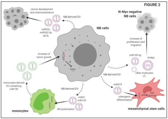 In addition, as summarized in Figure 2, EV released by NB cells are able to promote tumor growth and metastases. This is achieved by the transfer of miRNAs or genes from NB cells to neighboring NB cells, or by modulation of the function of other cell populations present in the tumor microenvironment, such as MSC and monocytes. In this context, EV released by the latter cells are able to increase tumor growth. Finally, EV released by NB cells may be modulated by chemotherapy, and their composition may predict resistance to standard therapies.