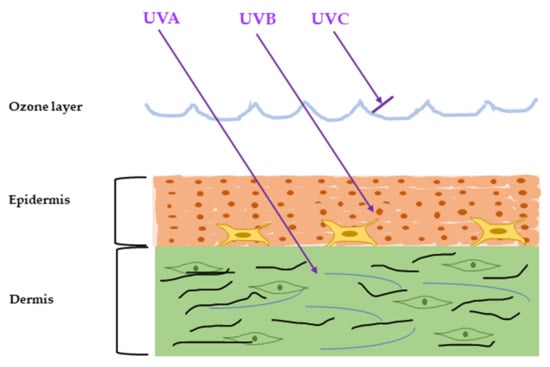 The ultraviolet radiation (UVR) is emitted naturally from the sun and artificial sources and can cause severe damage to the skin, referred to as sun burn. The major artificial sources of UVR are mercury vapor lamps, water-cooled lamps, and air-cooled lamps mainly used for diagnosis and treatment purposes. Chronic exposure to UVR with less dosage causes sun-tan and accelerates skin aging, called photoaging. UVR from sunlight can be classified into three types by their wavelength: UVA (320–400 nm), UVB (280–320 nm), and UVC (100–280 nm) [4]. Among them, almost all UVC and some UVB are absorbed by the ozone layer and do not have any impact on our skin [5,6]. The rest of the UVB can penetrate the skin epidermis and cause erythema (sunburn), while UVA can invade the dermis and is about 98% responsible for major skin aging [7] (Figure 1).