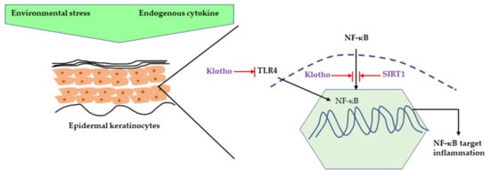 - Zhang, B.; Xu, J.; Quan, Z.; Qian, M.; Liu, W.; Zheng, W.; Yin, F.; Du, J.; Zhi, Y.; Song, N. Klotho Protein Protects Human Keratinocytes from UVB-Induced Damage Possibly by Reducing Expression and Nuclear Translocation of NF-κB. Med Sci. Monit. 2018, 24, 8583–8591. [Google Scholar] [CrossRef]