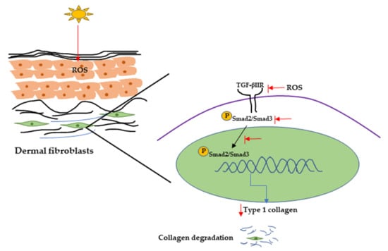 UVR can also initiate collagen degradation by reducing procollagen synthesis, and it has been reported that UVR can reduce procollagen synthesis by downregulating the TGF-β/Smad signaling pathway [102]. TGF-β initiates signaling through binding with cell surface receptors (TGF-β type I and type II receptors), then transcription of TGF-β-associated genes by phosphorylating Smad2/Smad3 complex. It has been reported that TGF-β can activate promoter activity of Type I collagen gene (COL1A2) through the Smad signaling pathway [103]. One report showed that UV irradiation inhibits the Smad2/Smad3 nuclear translocation, resulting in decreased TGF-β type II receptor transcription and protein synthesis and procollagen type I expression in hairless mice and in human dermal fibroblasts [76,102,104] (Figure 4).