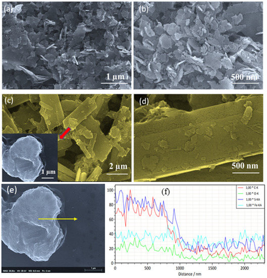 SEM images of (a,b) δ-FeOOH, (c,d) ABT/δ-FeOOH; (e) SEM image with a yellow arrow indicating the EDX line scan position; (f) the relative intensities of the different elements (i.e., C, O, S, and Fe) obtained by EDX line scan on the surface of ABT/δ-FeOOH material.