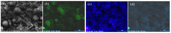 EDX mapping images of ABT/δ-FeOOH material (a) SEM image corresponding to (b) Oxygen, (c) Iron and (d) Sulfur elements.