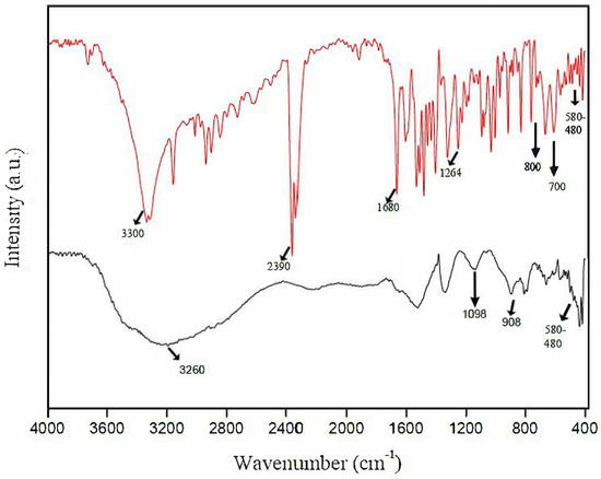 The FTIR spectra of δ-FeOOH/ABT (red line) and δ-FeOOH (black line).