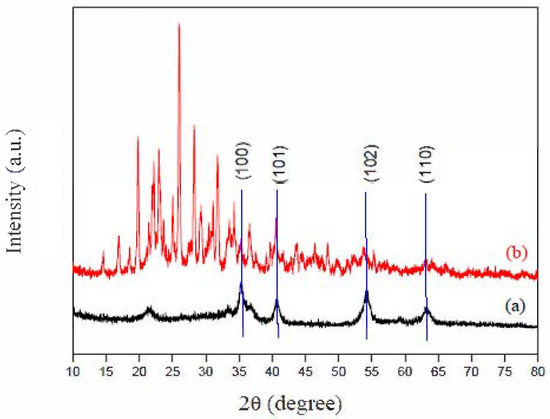Figure 4 shows the XRD patterns of the δ-FeOOH and ABT/δ-FeOOH materials. In Figure 4a, the main crystalline phase was identified as δ-FeOOH according to JCPDS File 13–87 (Figure 4a). However, after modifying the material, it is possible to observe several peaks on the surface of δ-FeOOH, probably due to the organic compounds formed during the synthesis (Figure 4b).