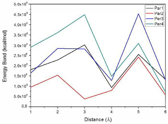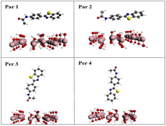 After that, the DFT method was used to evaluate the binding modes of the ABT and δ-FeOOH molecules and the energy values for these configurations. Compared to the perpendicular configurations, the energy values for both parallel configurations, Par3 and Par4, suggested higher energy values, as shown in Figure 5 and Figure 6, respectively. The effective contact area between the ABT molecule and the feroxyhyte surface, as well as the atomic correlation between ABT and the feroxyhyte surface, can, in principle, generate some energy modification. In a previous study, Corrêa et al. pointed out that the charge density is higher when near to O atoms, which can lead to electron transfer from Fe to O atoms in iron oxides. These results are in agreement with the calculated density states map (Figure 7) [16].