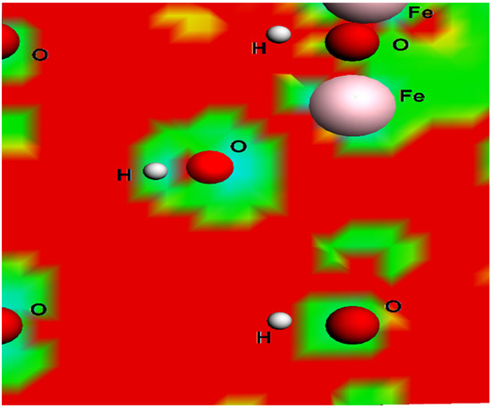 Electrostatic surface contours of δ-FeOOH plane (100). Red and green indicate volumes of low electron density and high electron density, respectively.