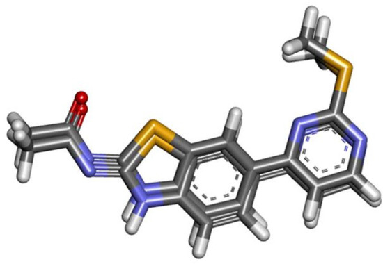The RMSD (Root-mean-square deviation) value for the superposition was 0.84 Å for PI3K, showing that the Molegro software is efficient in reproducing the conformation of the crystallographic ligand. The literature reports that values less than 2.00 Å are acceptable [28,29]. The re-docking overlap is presented in Figure 8.