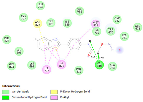 Analyzing the interactions that occurred during the docking simulation (Figure 10), it was observed that the ABT/δ-FeOOH complex performed several intermolecular interactions in the molecular docking simulation. More specifically, the ABT/δ-FeOOH complex formed two hydrogen bonds with Val740 in addition to short-range hydrophobic interactions with Met 811, Ile 821, Ile 737, and Asp 822. However, we did not observe interactions with the metal. In line with that, our results suggest that the addition of δ-FeOOH in the ABT ligand can help in accommodating the complex in the enzyme site.