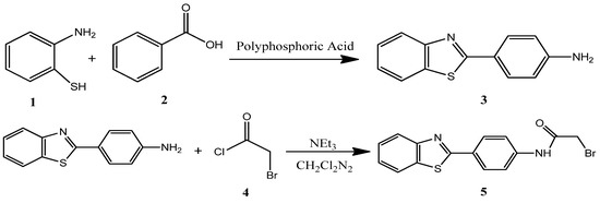 As displayed in Figure 11, the derivative of benzothiazole, (N-(4’-aminophenyl) benzothiazole-2-bromoacetamide), was obtained in two steps using 2-aminothiophenol as a starting material by oxidative condensation with 4-aminobenzoic acid to obtain 2-(4’-aminophenyl)benzothiazole (ABT). Compound 5 was synthesized after acetylation of ABT with bromoacetyl chloride [16].