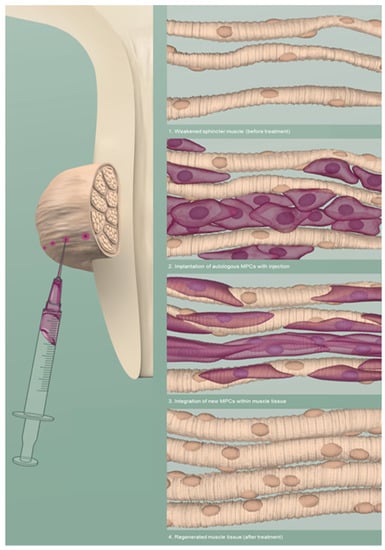 Regeneration of skeletal muscles is a highly orchestrated process that involves tight regulation of multiple cellular and molecular responses. Satellite cells can be found in the sublaminar layer of every skeletal muscle and are normally in a resting state. Upon certain stimuli (i.e., trauma or strain), they re-enter the cell cycle and differentiate into muscle progenitor cells (MPCs). The majority of MPCs are committed to the myogenic lineage and are therefore most suitable for muscle engineering. Extensive studies have examined this process in detail and have shown that MPCs are an ideal cellular model to study muscle tissue regeneration in the preclinical and clinical setting (see following paragraphs). Interestingly, MPC-based therapies have been proposed not only as a novel treatment option for SUI, but also in various other muscle diseases (genetic and acquired muscle disorders) [,].