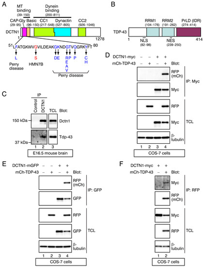 Interactions between DCTN1 and TDP-43. (A,B) Schematic diagrams of DCTN1 (A) and TDP-43. (B). In (A), disease-linked mutations within the DCTN1 CAP-Gly domain are indicated. In (B), the domain architecture of TDP-43 was modified from Winton et al. [20] and Guo et al. [21]. MT: microtubule. (C) Detection of interactions of endogenous Dctn1 and Tdp-43 proteins in E16.5 mouse brains. Whole brain lysates were immunoprecipitated with a control IgG or an anti-DCTN1 antibody. The immunoprecipitates and lysates were probed with antibodies as indicated in Western blots. IP: antibody used for immunoprecipitation; Blot: antibodies used for Western blotting. TCL: total cell lysates. (D,E) Interactions between DCTN1-myc (D) or DCTN1-mGFP (E) and mCherry-TDP-43 (mCh-TDP-43) proteins expressed in COS-7 cells were detected by coimmunoprecipitation. Tagged DCTN1 was immunoprecipitated using anti-myc or anti-GFP, and mCherry-TDP-43 in the immunoprecipitates was detected using anti-RFP. (F) Coimmunoprecipitation of DCTN1-myc and mCherry-TDP-43 in COS-7 cells in the reverse direction, relative to (D); mCherry-TDP-43 was immunoprecipitated using anti-RFP, and DCTN1-myc in the immunoprecipitates was detected using anti-myc.