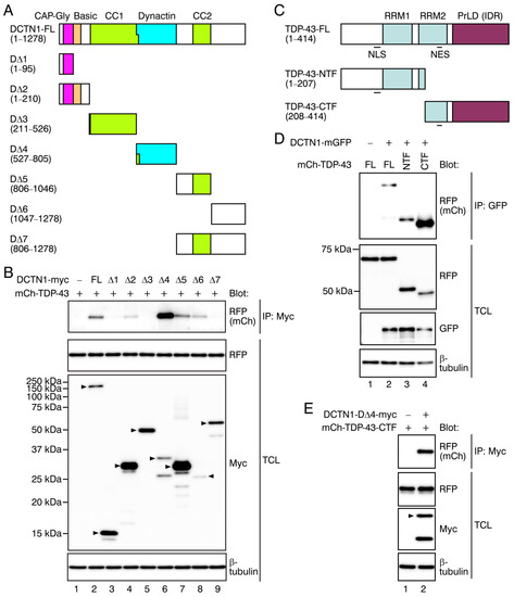 The interacting regions of DCTN1 and TDP-43. (A) Schematic representations of a series of truncated forms of mutant DCTN1 used in this study. FL: full-length. (B) Coimmunoprecipitation (co-IP) of DCTN1-myc mutants with mCherry-FL TDP-43 in COS-7 cells. Immunoprecipitation and Western blotting were performed using the antibodies indicated. Arrowheads in the Western blots indicate the expected positions of tagged DCTN1 fragments. (C) Schematic representations of the N-terminal fragment (NTF) and C-terminal fragment (CTF) of TDP-43. (D) Coimmunoprecipitation between FL DCTN1-mGFP and mCherry-TDP-43-NTF or CTF. (E) Coimmunoprecipitation between myc-tagged DCTN1 D∆4 fragment and mCherry-tagged TDP-43-CTF.