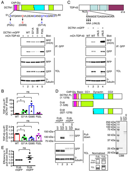 Effects of missense mutant DCTN1 and NLS-deficient mutant TDP-43 on the DCTN1-TDP-43 interactions, and in vitro DCTN1-TDP-43 binding. (A) Interactions of disease-linked missense mutants of DCTN1-mGFP, p.G71A (Perry disease), p.G59S (HMN7B), or p.F52L (Perry disease) with mCherry-tagged wild-type (WT) TDP-43 were examined by coimmunoprecipitation (co-IP) in COS-7 cells. (B) Quantification of interactions of DCTN1 missense mutants with WT TDP-43, relative to WT DCTN1. The top panel shows the ratio of mCherry-TDP-43 to DCTN1-mGFP in the immunoprecipitates, and the bottom panel shows the ratio of the immunoprecipitated mCherry-TDP-43 normalized to levels of β-tubulin in the total cell lysates (TCL). Here and in subsequent figures, data are represented as the mean ± SEM. n = 4 (independent experiments). * p < 0.05 compared to WT by two-tailed paired t-test. ns: not significant. (C) Interactions between WT DCTN1-mGFP and TDP-43-∆NLS mutant. (D) A GST pull-down assay between DCTN1 fragments and GST-fused WT TDP-43. Cell lysates prepared from COS-7 cells expressing truncated mutant DCTN1 (D∆8-mGFP or D∆9-mGFP, top panel) were incubated with glutathione Sepharose beads preloaded with purified GST control or GST-TDP-43 (bottom right panel). The bound DCTN1 fragment was detected by Western blotting using anti-GFP (bottom left panel). The result was normalized according to the GFP signal intensity in TCLs, and is shown in the inset. (E) Quantification of DCTN1 truncated mutants pulled down with GST-TDP-43. The GST-pulled-down levels of D∆9-mGFP were normalized to those of D∆8-mGFP. n = 4 (independent experiments). p = 0.2949 (two-tailed paired t-test).