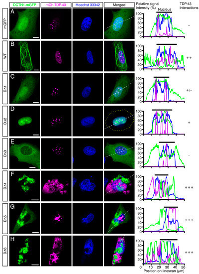 On the other hand, DCTN1 has long been implicated in ALS pathogenesis [73,74,75,76]. A slowly progressive, ALS-like motor neuron disease, HMN7B, is indeed caused by the p.G59S mutation in DCTN1, although HMN7B does not accompany TDP-43 proteinopathy at detectable levels [44,50]. In this study, we noted that DCTN1G59S caused moderate but significant levels of TDP-43 aggregation in the nucleus and cytoplasm (Figure 5D,E). In addition, as mentioned above, knockdown of DCTN1 causes motor neuron degeneration [27]. However, the mechanistic basis by which DCTN1 dysfunction contributes to ALS pathogenesis has remained unknown. Our hypothesis that dysregulation of DCTN1–TDP-43 interactions and/or the imbalance in DCTN1 expression perturb TDP-43 transport from axonal tips to the nucleus, and cause TDP-43 aggregation in the cytoplasm and axoplasm may also be applicable to ALS or ALS-related neurodegenerative diseases.