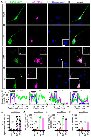 Human iPSC-derived neuronal cultures have recently been utilized as cellular models of various neurodegenerative diseases [65]. We thus used human iPSC-derived neurons to further recapitulate the aggregation of DCTN1 and TDP-43 in human patient brains. The proneural transcription factor NEUROG2-expressing iPSCs (201B7) were differentiated into neurons harboring neurites (see Section 4.4 for the differentiation procedure) [66,67,68,69,70]. The neurons were transfected with the mGFP control or DCTN1-mGFP (wild-type, p.G71A or D∆4) and mCherry-tagged TDP-43 (wild-type) expression plasmids. The transfected neurons were subjected to confocal microscopy. In cells coexpressing DCTN1G71A or D∆4 with TDP-43, significant levels of TDP-43 cytoplasmic mislocalization were induced (Figure 6A–C). Furthermore, DCTN1 and TDP-43 aggregates of variable sizes were detected in the cytoplasm and neurites (Figure 6A,D,E), revealing that mutant DCTN1 induced mislocalization and aggregation of wild-type TDP-43 protein in human neurons. In particular, to our surprise, ectopic TDP-43 distributions were significantly detected even in neurites of neurons coexpressing DCTN1G71A or D∆4 and TDP-43 (Figure 6A,F). In addition, remarkable levels of clearance of TDP-43 from the nucleus were found in mutant DCTN1-expressing neurons (Figure S4). Furthermore, similar to U2OS cells transfected with mutant DCTN1 and TDP-43, abnormal nuclear morphology was frequently observed in the neurons coexpressing DCTN1G71A or D∆4 and TDP-43 (Figure 6A, p.G71A, inset and Figure S4, D∆4). Taken together with our biochemical finding that DCTN1 binds to TDP-43, these results provide evidence to support a role for DCTN1 in regulating TDP-43 retrograde cytoplasmic-nuclear transport and aggregation in both non-neuronal and neuronal cells. In addition, mutant DCTN1 appeared to cause nuclear membrane disruption.