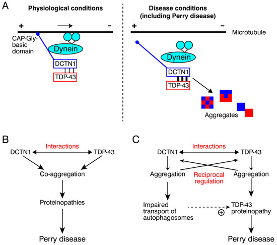 One mechanistic scenario triggering Perry disease is that a missense mutation in the DCTN1 CAP-Gly domain causes dysregulation of DCTN1-TDP-43 interactions, leading to coaggregation of DCTN1 and TDP-43, which drives the symptomatic progression of Perry disease (Figure 7B). The second, but nonmutually exclusive, scenario is that mutant DCTN1 aggregation promotes TDP-43 aggregation, and vice versa, forming reciprocal regulation loops for mutual nucleation (Figure 7C). For example, DCTN1 aggregation may perturb efficient autophagosome transport and cytoplasmic–nuclear transport of TDP-43. Resultant accumulation of TDP-43 aggregates may predominantly contribute to the pathogenesis of Perry disease. To understand the underlying pathogenic mechanisms, further studies are needed to determine the toxicity of DCTN1 aggregates. Alternatively, it is possible that the coexistence of DCTN1 aggregates increases the stability of TDP-43 aggregates, which in turn elevates the toxicity of aggregated TDP-43 [72]. Under physiological conditions, wild-type DCTN1 may suppress cytoplasmic aggregation of TDP-43 by facilitating proper TDP-43 cytoplasmic-nuclear transport and even the nuclear import (see below).