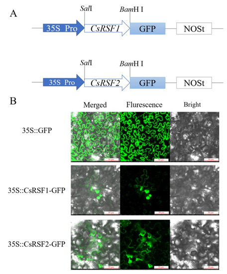 The coding regions of CsRSF1 and CsRSF2 were amplified using PrimeSTAR GXL DNA polymerase (Takara, Dalian, China). The PCR amplification procedure was as follows: 98 °C (10 s), 56 °C (15 s), and 68 °C (3 min) for 35 cycles. The PCR products were detected by agarose gel electrophoresis and ligated to the 3′ end of the GFP coding region without the stop codon in the p35S:GFP vector, generating the fusion constructs p35S:GFP-CsRSF1 and p35S:GFP-CsRSF2. The recombinant plasmids p35S:GFP-CsRSF1, p35S:GFP-CsRSF2, and p35S:GFP were separately transformed into Agrobacterium tumefaciens strain EHA105 and then centrifuged after overnight culture. The precipitate after centrifugation was cultured in induction medium (10 mmol·L−1 2-(4-morpholino) ethanesulfonic acid (MES), pH 5.7, 10 mmol·L−1 MgCl2 and 200 mmol·L−1 acetosyringone (AS)), collected and diluted to OD600 = 0.6, and then infiltrated into Nicotiana benthamiana leaves. The plants were incubated at 25 °C for 3 days after injection, and point GFP signals were observed and photographed using a laser confocal fluorescence microscope (Leica, TSC SP8, Solms, Germany) with an excitation wavelength of 488 nm and 505 to 530 nm bandpass emission filter.