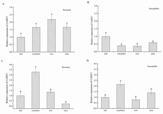 The expression patterns of CsRSF1 and CsRSF2 in different organs (leaves, cotyledons, stems and roots) of susceptible and resistant cultivars were analyzed by qRT–PCR (Figure 2). The results showed the expression patterns of CsRSF1 and CsRSF2 were different in various organs in the resistant and susceptible cultivars. Among the resistant cultivars, CsRSF1 exhibited the highest expression in roots, followed by leaves and cotyledons, but it was weakly expressed in stems (Figure 2A). Nevertheless, CsRSF1 in the susceptible cultivar was relatively highly expressed in leaves, followed by stems, roots, and cotyledons (Figure 2B). Moreover, CsRSF2 in the resistant cultivars was significantly expressed in cotyledons but barely expressed in stems, leaves, and roots (Figure 2C). In the susceptible cultivars, CsRSF2 was significantly expressed in cotyledons and stems, followed by leaves and roots (Figure 2D). This result indicated CsRSF1 and CsRSF2 genes showed varied expression patterns among organs in cucumber. The resistance of CsRSF1 and CsRSF2 may be different in various organs in the resistant and susceptible plants.