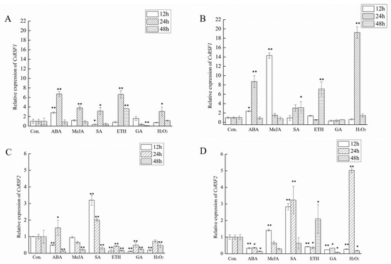 Expression patterns of CsRSF1 and CsRSF2 genes under exogenous substances. These exogenous substances include 100 µmol·L−1 abscisic acid (ABA), 100 µmol·L−1 jasmonate (MeJA), 1 mmol·L−1 salicylic acid (SA), 10 μL·L−1 ethephon (ETH), 100 mg·mL−1 gibberellin (GA), 10 μmol·L−1 hydrogen peroxide (H2O2). (A) qRT–PCR analyses of CsRSF1 transcripts in the resistant cultivar. (B) qRT–PCR analyses of CsRSF1 transcripts in the susceptible cultivar. (C) qRT–PCR analyses of CsRSF2 transcripts in the resistant cultivar. (D) qRT–PCR analyses of CsRSF2 transcripts in the susceptible cultivar. The relative expression levels of CsRSF1 and CsRSF2 in cucumber plants at various time points (12 h, 24 h, 48 h) were compared with the mock control, which was set to 1. Expression analysis of candidate genes using the 2−ΔΔCt method. Data are means ± standard deviations (SD) from three biological replicates per cultivar. The asterisks indicated a significant difference (Student’s t-test, * p < 0.05 or ** p < 0.01).