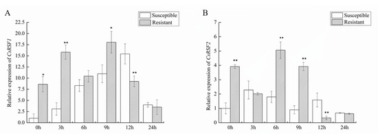 Expression patterns of CsRSF1 and CsRSF2 in resistant (B21-a-2-1-2) and susceptible (B21-a-2-2-2) varieties were inoculated with S. fuliginea. (A) The expression of CsRSF1 in resistant and susceptible varieties were inoculated with S. fuliginea. (B) The expression of CsRSF2 in resistant and susceptible varieties were inoculated with S. fuliginea. Expression analysis of candidate genes at 0, 3, 6, 9, 12 and 24 hpi (hours post-inoculation) using the 2−ΔΔCt method. The expression level in B21-a-2-2-2 was the mock control as 1. Data are means ± standard deviations (SD) from three biological replicates per cultivar. The asterisks indicated a significant difference (Student’s t-test, * p < 0.05 or ** p < 0.01).
