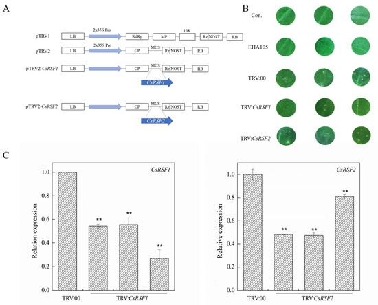 The full CDS sequences of the CsRSF1 and CsRSF2 genes were subcloned into a modified pRI101-AN-GFP vector with a GFP tag, resulting in the transformation vector pRI101-AN-GFP:CsRSF1 and pRI101-AN-GFP:CsRSF2. The cloning site was between BamHI and SalI. The gene-specific primers are listed in Table S1. The constructed vectors and pRI101-AN-GFP were transformed into A. tumefaciens strain EHA105. The transformation method was the same as described earlier.
