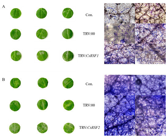 Coomassie brilliant blue R250 staining was used to observe the S. fuliginea hyphae on the cotyledons with the control of TRV:00, TRV:CsRSF1, TRV:CsRSF2, GFP: 00, GFP:CsRSF1, and GFP:CsRSF2 transgenic plants on day 7 with S. fuliginea. The infected cotyledons of control and transgenic plants were immersed in a destaining solution (containing 0.225 g trichloroacetic acid, 150 mL of absolute ethanol, and 50 mL of acetone) for 30 min at 70 °C. The samples were then stained with Coomassie brilliant blue R250 solution (containing 0.225 g trichloroacetic acid, 0.9 g Coomassie brilliant blue R250, and 150 mL of methanol) for 2 min at room temperature. After the samples were washed with sterile water, they were immersed in 20% glycerol and photographed. The fungus was visualized under a light microscope (Nikon Ts2, Tokyo, Japan).