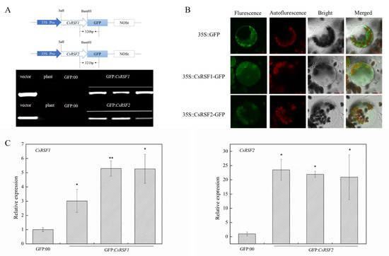 Bioinformatics prediction indicated that the CsRSF1 protein was localized in the cytoplasm and cell membrane, and the CsRSF2 protein was localized in the cytoplasm. To confirm this, the p35S:GFP-CsRSF1/CsRSF2 fusion vector was constructed (Figure 1A), and the p35S:GFP-CsRSF1/CsRSF2 and the control p35S:GFP vectors were separately introduced into tobacco leaves. Confocal microscopic examination showed that CsRSF1 and CsRSF2 proteins were both located in the cytoplasm and cell membrane. In addition, the CsRSF1 protein was also located in the nucleus (Figure 1B).