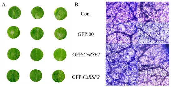 Identification disease-resistance of CsRSF1/CsRSF2- overexpressing plants after S. fuliginea infection. (A) Phenotypic analysis for CsRSF1 and CsRSF2 transient overexpressing cucumber cotyledons after S. fuliginea infection. (B) Coomassie brilliant blue staining for examining CsRSF1 and CsRSF2 transient overexpressing cucumber cotyledons after S. fuliginea infection. Con. indicates non-injected plants, GFP:00 indicates GFP:00-injected plants, GFP: CsRSF1/CsRSF2 indicates overexpressing plants. Bars = 100 µm.