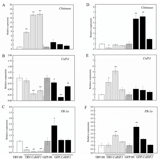 CsRSF1 and CsRSF2-mediated expression patterns of defense-related genes (Chitinase, CuPi1, PR-1a) in transient silencing (TRV) and overexpressing (GFP) cucumber cotyledons. (A–C) The relative expression of Chitinase, CuPi1, PR-1a in CsRSF1 -transient silencing and overexpressing cucumber cotyledons. (D–F) The relative expression of Chitinase, CuPi1, PR-1a in CsRSF2 -transient silencing and overexpressing cucumber cotyledons. Data are means ± standard (SD) deviations from three independent experiments, and each column represents a sample containing three cucumber cotyledons from different plants. Expression analysis of candidate genes using the 2−ΔΔCt method. The asterisks indicated a significant difference (Student’s t-test, * p < 0.05 or ** p < 0.01).