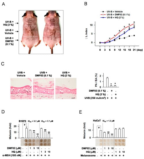 2.2. DMF02 Reduced UVB-Induced Pigmentation in HRM-2 Mice Skin