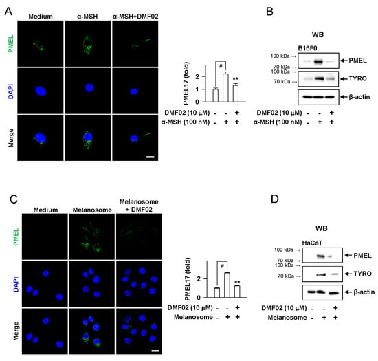 2.3. DMF02 Decreased Melanin Production in Melanocytes and Keratinocytes Containing Transferred Melanosomes