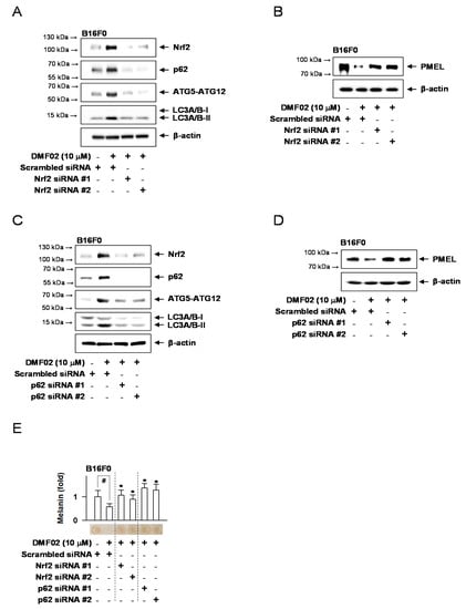 2.7. Nrf2 Knockdown Decreased DMF02-Induced Autophagy, Blocking Melanosome Degradation in Melanocytes
