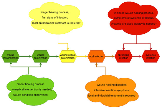 Wound infections are caused by biofilms–complex structures consisting of a large bacterial/yeast cell population communicating with each other and producing a heterogeneous, protective, extracellular matrix. Biofilm formation within the wound causes therapeutic issues, mostly due to the high tolerance of this structure to physical and chemical eradicative agents. A biofilm-based wound infection can also develop into a life-threatening, systemic infection [2,3,4]. The process of development of a biofilm-based infection in a wound and the corresponding clinical symptoms are presented in Figure 1.
