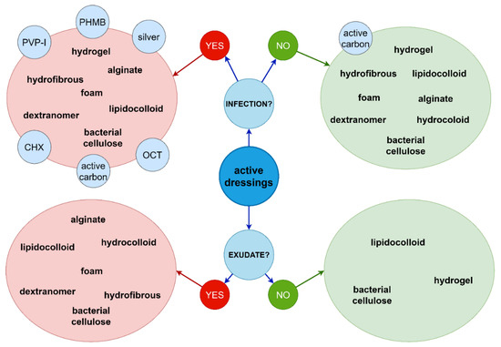 Examples of commercially available modern active dressings and their applications [84,86,87,88,89,90,91,92,93,94,95,96]. PHMB—polyhexanide; PVP-I—povidone-iodine; CHX—chlorhexidine; OCT—octenidine.