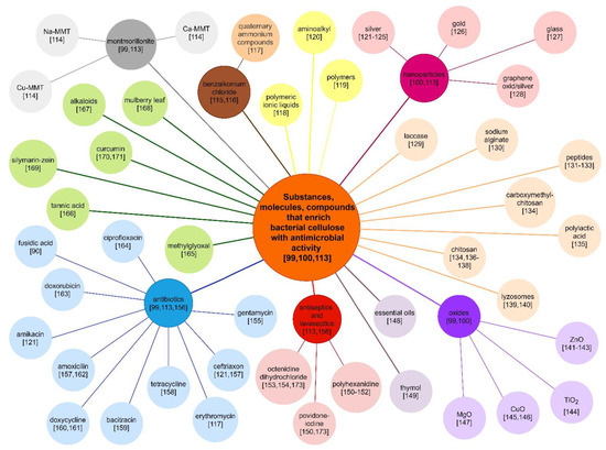 The studies listed above have shown that bacterial cellulose is safe for use as a dressing for non-healing wounds. Native BC has no antimicrobial activity. However, BC’s ability to absorb high amounts of fluids and wide possibilities of its modification enable enrichment of BC with antimicrobial substances. There are some commercially available BC dressings—some of them made of native cellulose—But there are also dressings containing such substances as sodium hyaluronate or antimicrobial polyhexanide, or chlorhexidine. The interest in BC functionalization with various antimicrobial compounds is constantly growing. The examples of compounds, substances and molecules that are the subject of research (as additives to BC affecting its bactericidal activity) are presented in Figure 3 [92,99,100,113,114,115,116,117,118,119,120,121,122,123,124,125,126,127,128,129,130,131,132,133,134,135,136,137,138,139,140,141,142,143,144,145,146,147,148,149,150,151,152,153,154,155,156,157,158,159,160,161,162,163,164,165,166,167,168,169,170,171,172,173].