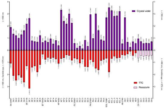 Comparison of metabolic activity of cells in the biofilm to total biofilm mass of the analyzed strains. The amount of formed biofilm was measured using crystal violet (λ = 550 nm), and biofilm metabolic activity was measured with 2, 3, 5- triphenyl tetrazolium chloride (TTC, λ = 490 nm), and with resazurin (λ = 570 nm, only Candida spp.). Tested strains: SA—Staphylococcus aureus, SE—Staphylococcus epidermidis, EF—Enterococcus faecium, KP—Klebsiella pneumoniae, EC—Escherichia coli, PA—Pseudomonas aeruginosa, ECL—Enterobacter cloacae, AB—Acinetobacter baumannii, CA—Candida albicans.