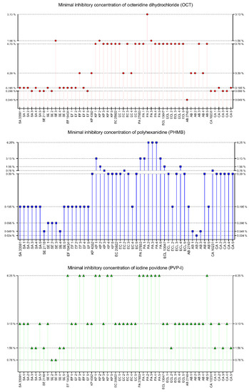 All substances were tested in the range of 50–0.098% of working solution (concentration provided by the manufacturer). If MIC was not observed, the concentration range was extended to 0.0015%. OCT inhibited the growth of all tested microorganisms within the tested concentration range. MIC values were observed between 0.049% and 3.13% of OCT working solution (0.5% of OCT). The strongest effects (the lowest MIC) were observed for A. baumannii PMC 2740 strain (0.049%), C. albicans, S. aureus, S. epidermidis and E. faecium strains (0.098–0.195%, except for two strains: SE3 and EF3). The weakest effects were observed for PA2 (3.13%), PA3, KP2 and SE3 (1.56%), and intermediate effects for EF3, K. pneumoniae ATCC 4352, EC2, EC4, AB1, AB2 and AB4 (0.39%) and for the rest of the tested strains (n = 20, 0.78%). OCT acted stronger on Gram-positive cocci and yeast than on Gram-negative rods. PHMB was effective against all tested strains. The range of product working solution for MIC was 0.024–6.25%. The strongest effects were observed for AB2 (0.024%), AB1, AB3, S. epidermidis PCM 2118 and SE4 (0.049%) and for SE1, SE2 and SE3 (0.098%). The weakest effects were observed for PA2, PA3, PA4 (6.25%), KP1, PA1, PA5, P. aeruginosa ATCC 27853 (3.13%) and for KP2, ELC4, E. cloacae ATCC 13047 (1.56%). Intermediate effects were observed for KP3, EC2, C. albicans ATCC 10231 (0.78%), K. pneumoniae ATCC 4352, KP4, KP5, E. coli ATCC 25922, EC1, EC3, EC5, ECL1. ECL3, ECL5, AB4, CA1–5, (0.39%) and 0.195% for the remaining strains (n = 17). PHMB acted better against Gram-positive cocci and A. baumannii strains than against the rest of Gram-negative rods and yeast. PVP-I also was effective against all tested strains. MIC values were observed between 0.78% and 6.25% of product working solution. The strongest effects were observed for SE2 and SE3 (0.78%), the weakest for E. faecium ATC 19434, EF3, EF4, KP1, KP2, KP4, KP5, P. aeruginosa ATCC 27853, PA1–PA5 and AB5 (6.25%) and intermediate for SA3, SA4, S. epidermidis PCM 2118, SE4, SE5, ELC2, CA1, CA3, CA5 (1.56%) and for the rest of tested strains (29, strains, 3.13%). The best action of PVP-I was observed against S. epidermidis and C. albicans strains and the weakest against P. aeruginosa and K. pneumoniae. The results for OCT, PHMB and PVP-I, are presented in Figure 5.