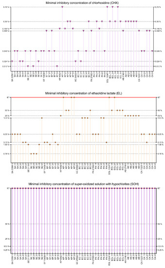 CHX was effective against all tested strains. The range of product working solutions for MIC was 0.0031–0.78%. The strongest effects were observed for S. epidermidis PCM 2118, SE2, EF5 (0.0031%), S. aureus ATCC 33591, SA3, SA4, SE4, E. coli ATCC 25922 and EC2 (0.012%). The weakest effects were observed for: KP1, E. cloacae ATCC 13047, ECL2, ECL4 (0.78%), KP3, KP4, EC5, PA2, PA4, ECL1, ECL3, ECL5 and AB1–AB5 (0.39%), and intermediate for: K. pneumoniae ATCC 4352, KP2, KP5, PA3 (0.195%), EF1, EF3, EC3, P. aeruginosa ATCC 27853, A. baumannii PCM 2740, C. albicans ATCC 10231, CA3, CA4 (0.098%) and the rest of the tested strains (n = 16, 0.049%). The highest activity of CHX was observed for Staphylococci and the weakest for E. cloacae, A. baumannii and K. pneumoniae. EL was effective for 49/54 strains in the tested concentration range. Strains KP1, KP4, KP5, E. cloacae ATCC 13047 and ECL2 were resistant to EL in 50% concentration. Against the rest of the tested strains, EL was effective in a concentration range from 0.78% to 50%. The strongest effects were observed for: SE1, SE2, SE3 (0.78%), S. epidermidis PCM 2118, SE4, EF2 and EF5 (1.56%). The weakest effects were observed for KP2, KP3, EC5, ECL1, ECL3, ECL4, ECL5 (50%), K. pneumoniae ATCC 4352, A. baumannii PCM 2740 and AB1–AB5 (25%) and intermediate for SE5, EC2, EC3, EC4, PA3, PA4 (12.5%), SA4, SA5, E. faecium ATCC 19434, EF1, EF4, PA5, CA2 (3.13%) and for the rest of the tested strains (15 strains, 6.25%). The best activity of EL was observed for S. epidermidis and E. faecium and the weakest for E. cloacae, A. baumannii and K. pneumoniae. SOH was not effective against any of the tested strains in the concentration range from 50 to 0.098%. The results for CHX, EL and SOH, are presented in Figure 6.