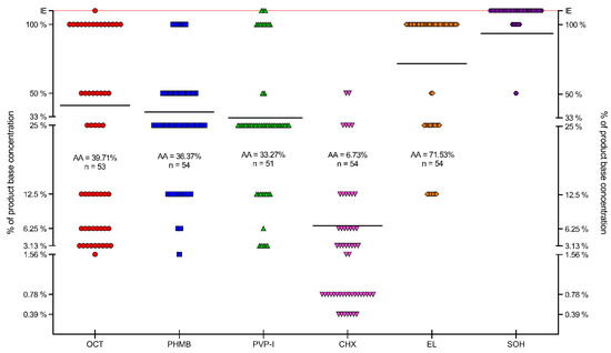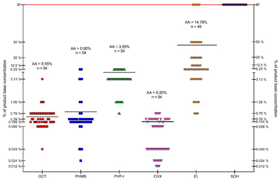 Distribution of MBEC values of the tested substances in the pool of strains. OCT—octenidine dihydrochloride, PHMB—polyhexanide, PVP-I—povidone-iodine, CHX—chlorhexidine, EL—ethacridine lactate, SOH—super-oxidized hypochlorites solution. AA—arithmetic average of MBEC values for all strains (black lines), n—number of strains included in AA, IE—compound ineffective.