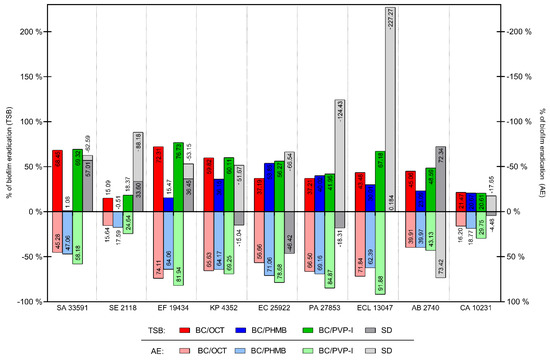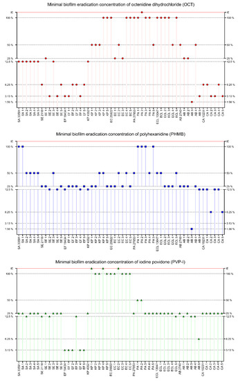 PVP-I was ineffective in three cases: KP1, KP4 and EC2. For the rest of the strains, MBEC values were in the range of 3.13–100%. The strongest effects were observed for E. faecalis strains (3.13%, except for EF3) and for AB5 (6.25%). The working solution of PVP-I (100%) was effective against KP2, KP3, KP5 and E. coli strains (except for EC2). For strains PA1 and PA2, PVP-I was effective at the concentration of 50%, and for SA2, S. epidermidis PCM 2118, SE2, EF3, ECL5, AB1, AB3, AB4 at the concentration of 12.5%. For the remaining strains (27 strains), PVP-I was effective at a concentration of 25%. The strongest action of PVP-I was observed against E. faecium strains and the weakest against K. pneumoniae and E. coli. The results of minimal biofilm eradication concentrations assay for OCT, PHMB and PVP-I are presented in Figure 8.